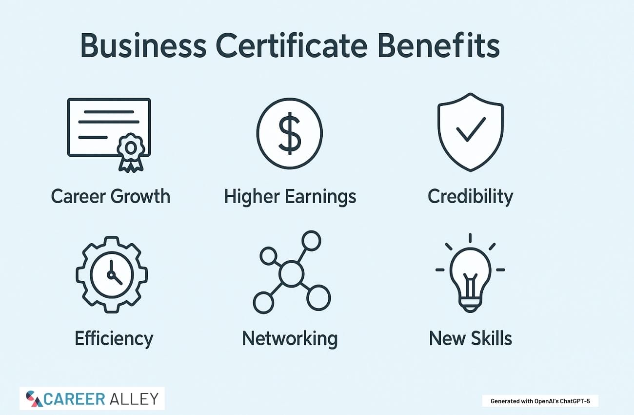 - Career Advantage: Earning business certificates equips you with relevant capabilities that strengthen your competitiveness, improve job mobility, and position you for long-term professional growth in a changing economy.