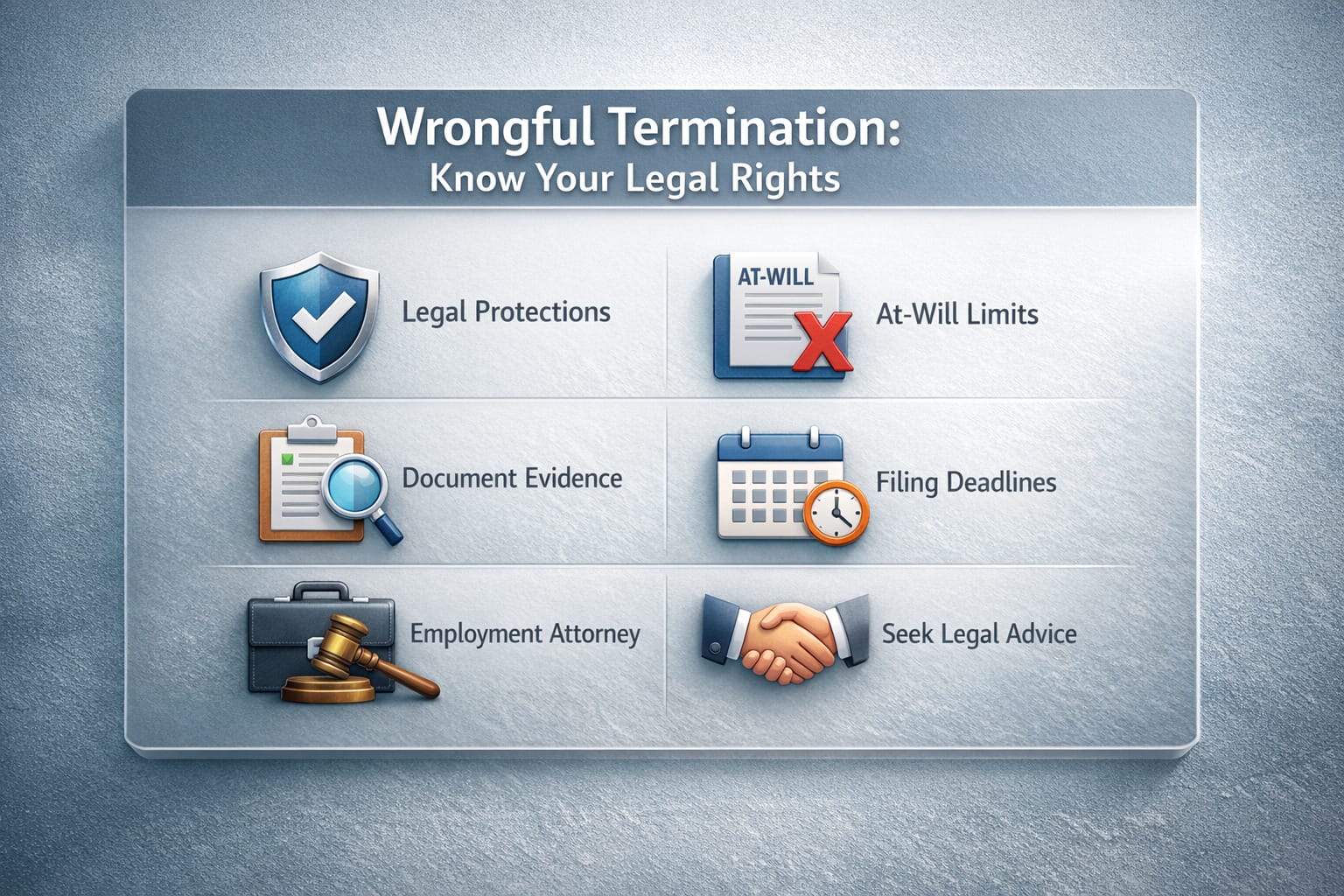 - Legal Protections: Federal and state laws prohibit termination based on discrimination, retaliation, whistleblowing, and violations of public policy.