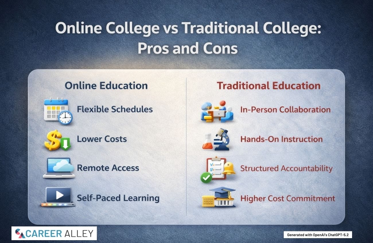 Strengths : In-person education excels at hands-on instruction,collaboration , and built-in accountability, particularly for students who thrive on structure and face-to-face engagement. - Cost Considerations: Traditional colleges often carry significantly higher costs, while online education reduces tuition, commuting, and relocation